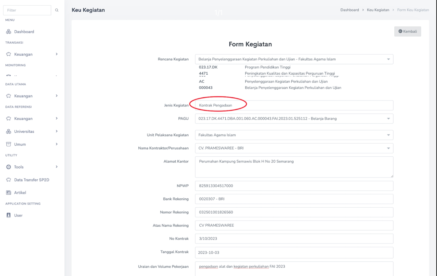 Setelah itu isi semua data yang dibutuhkan dengan memilih Jenis Kegiatan secara Kontrak Pengadaan.